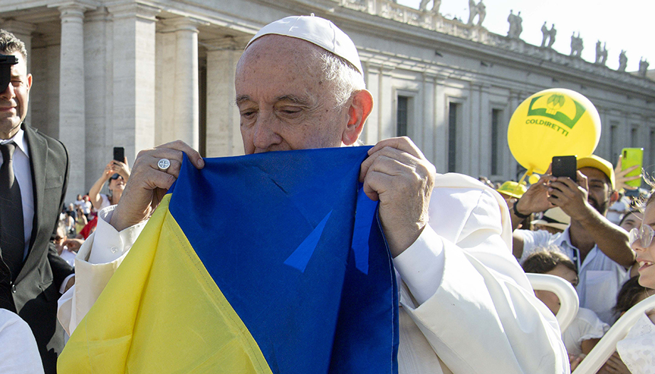 Joven ucraniana llora al darle al papa una carta sobre su padre, que está en la guerra